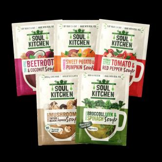 Experience the full Soul Kitchen collection with our 15-Serving Variety Pack. You’ll get 3 of each of our 5 flavours — Mexican Style Tomato & Red Pepper, Curried Sweet Potato & Pumpkin, Thai Style Beetroot & Coconut, Mushroom, Thyme & Black Pepper, and Super Greens: Broccoli, Leek & Spinach.